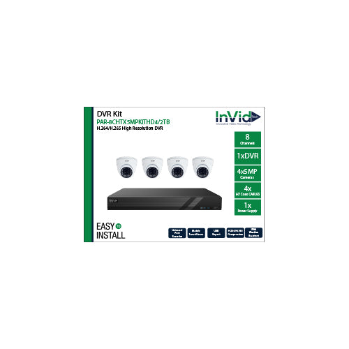 View full detailsInVid Tech PAR-8CHTX5MPKITHD4/2TB (1) 8CH DVR, (4) 5 Megapixel Cameras, (4) Plug and Play cables, (1) Power Supply, 2TB