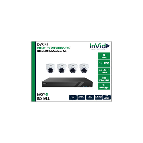 View full detailsInVid Tech PAR-8CHTX5MPKITHD6/2TB (1) 8CH DVR, (6) 5 Megapixel Cameras, (6) Plug and Play cables, (2) Power Supplies, 2TB