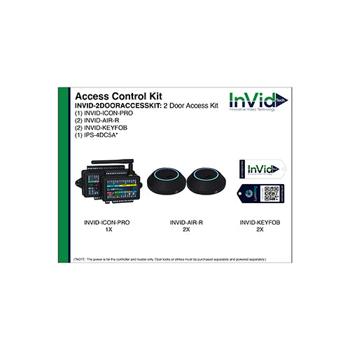 View full detailsInVid Tech INVID-2DOORACCESSKIT 1 - INVID-ICON-PRO, 2 - INVID-AIR-R, 2 - INVID-KEYFOB, 1 - IPS-4DC5A (NOTE: The power is for the controller and reader only. Door locks or strikes must be purchased separately and powered separately.)