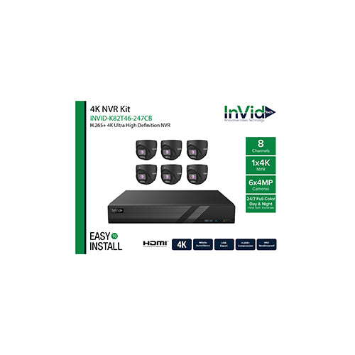 View full detailsInVid Tech INVID-K82T46-247CB (6) 4-Megapixel Turret Cameras with (1) 8 Channel NVR, 24/7 Full-Color Day AND Night Cameras, Black Housing