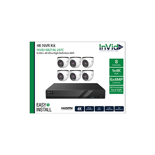 View full detailsInVid Tech INVID-K82T46-247C (6) 4-Megapixel Turret Cameras with (1) 8 Channel NVR, 24/7 Full-Color Day AND Night Cameras, 2TB Drive